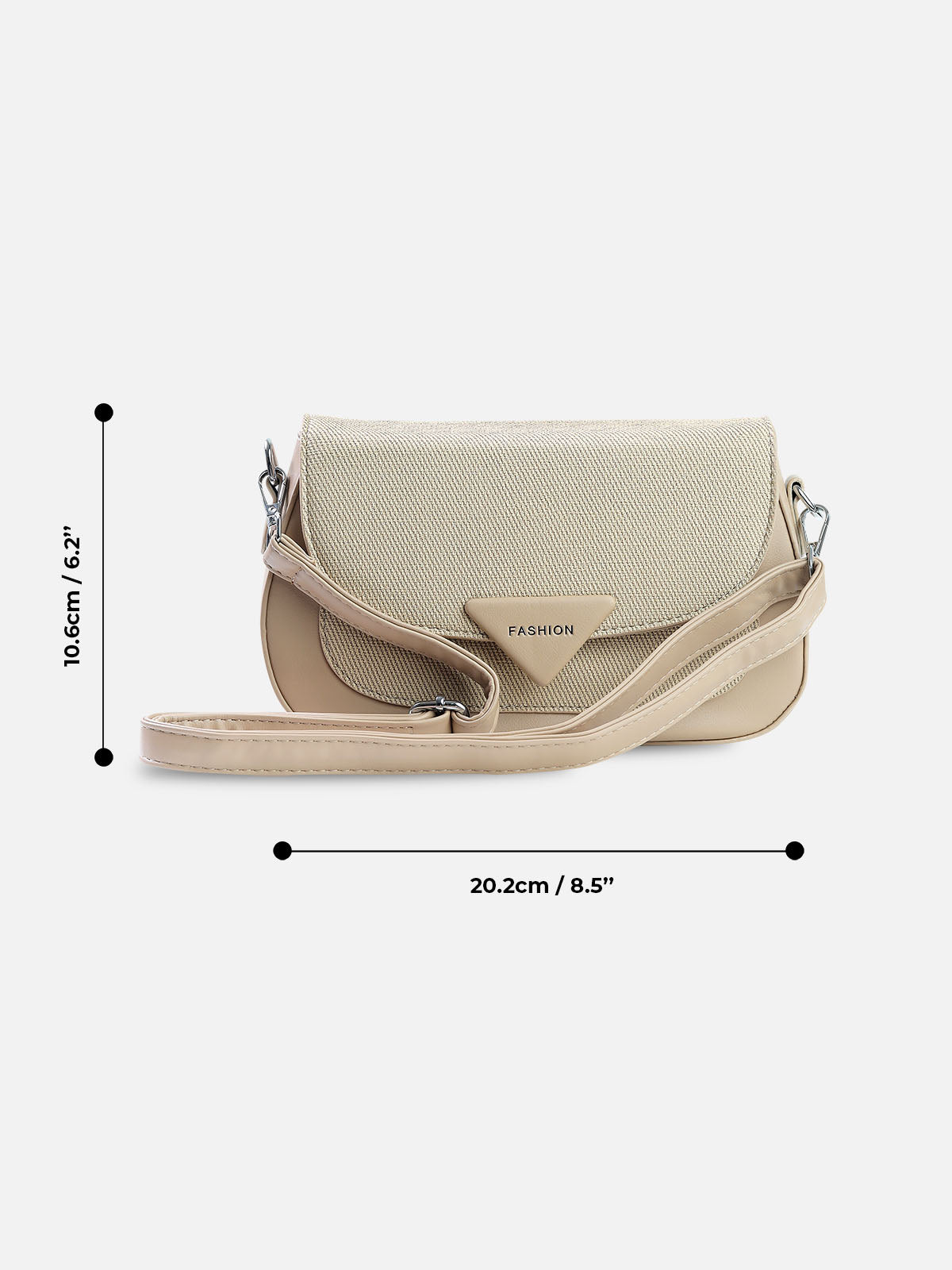 Sleek and stylish, the Classic Beige Textured Flap Shoulder Bag is the perfect blend of minimalism and modern design. Crafted with a canvas-style textured flap and smooth faux leather body, it features a structured silhouette and a subtle triangle accent embossed with the word FASHION for a contemporary touch.