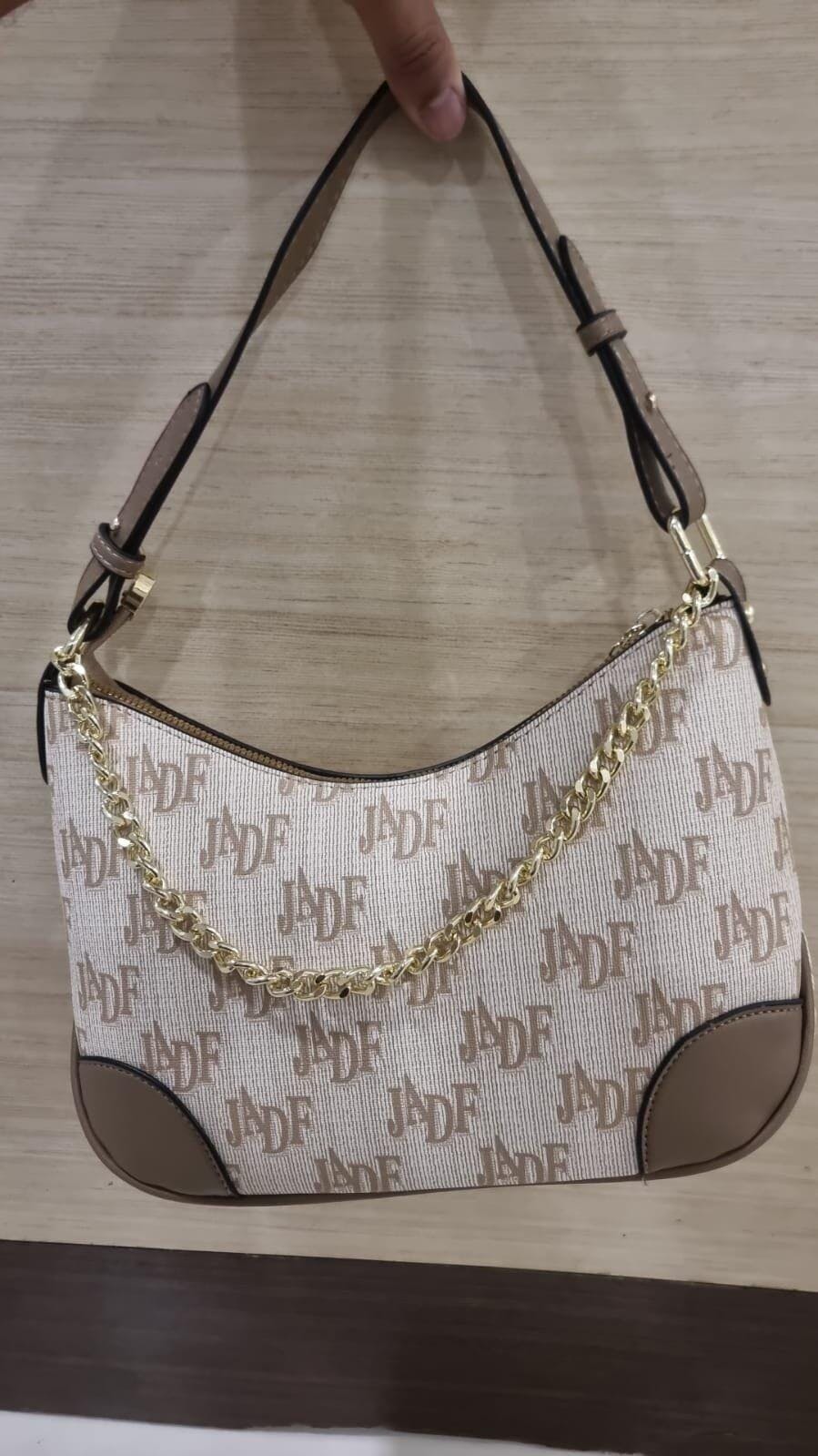 Refresh your accessories collection with this chic JADE monogram shoulder bag in soft beige canvas, detailed with tan faux leather accents and a gold-tone chain for an elevated look. The repeated "JADE" branding gives it a modern designer-inspired appeal, while the included adjustable strap offers versatile wear as a shoulder or crossbody bag. Sleek, stylish, and functional — it’s a must-have for both casual and dressy occasions.