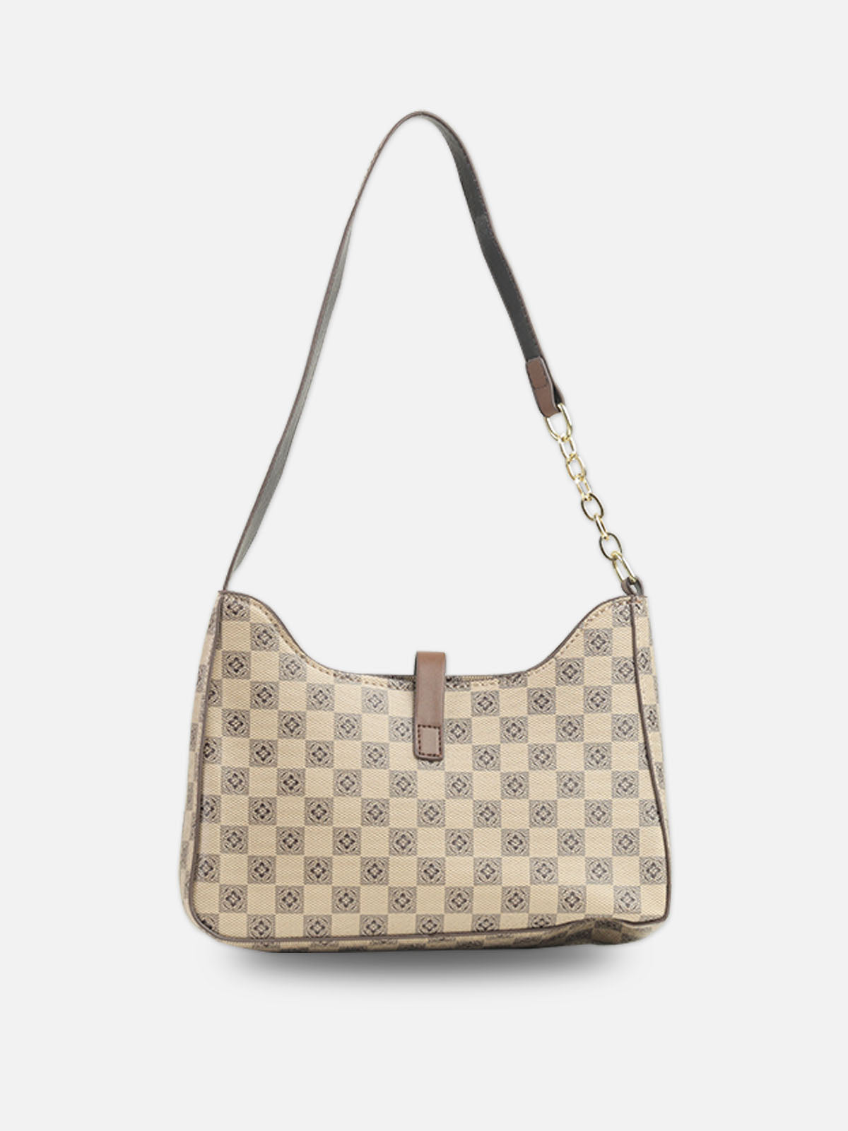 This chic monogrammed baguette bag is a sophisticated and versatile accessory, perfect for adding a touch of classic style to your look. The bag features a structured silhouette with a neutral-toned checkered monogram pattern, giving it a timeless designer feel.