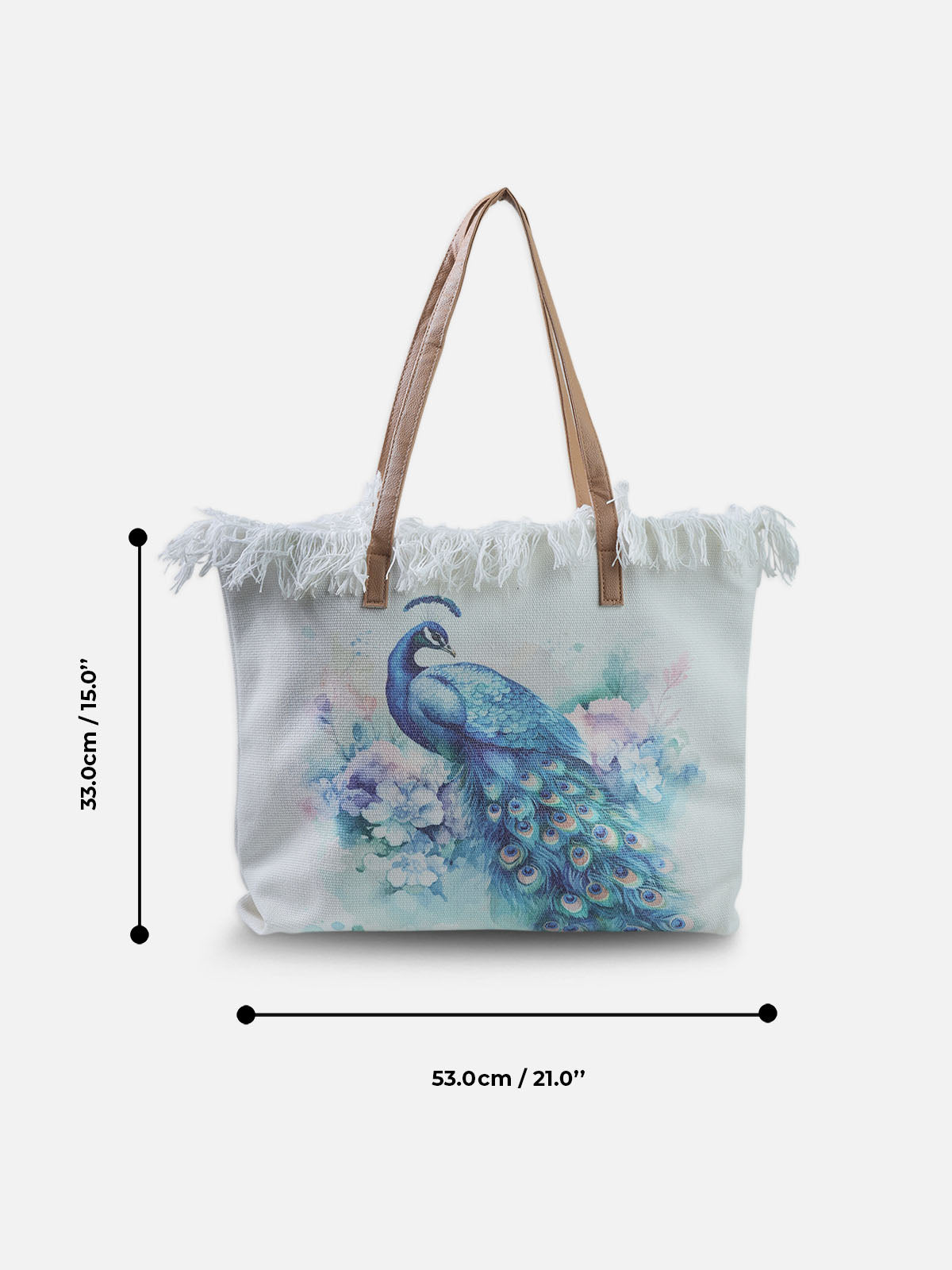 A stylish white tote bag adorned with a beautiful blue peacock design, complemented by brown leather handles and a decorative fringed top.