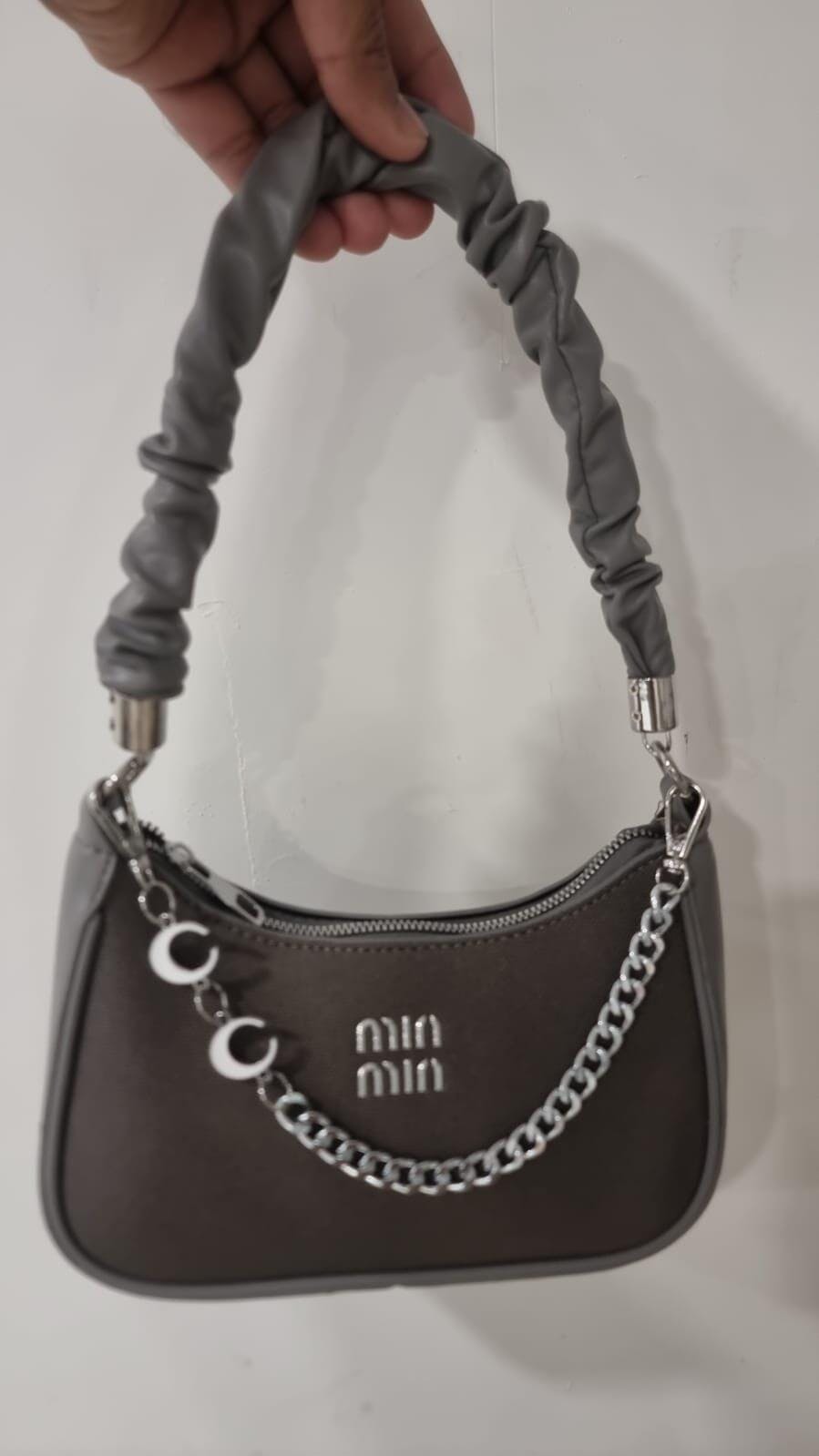 This fashionable gray crescent bag is a chic and unique accessory for a modern look. The body of the bag features a subtle glitter finish, complemented by smooth faux leather trim, creating an eye-catching contrast. Its curved silhouette is both trendy and compact.