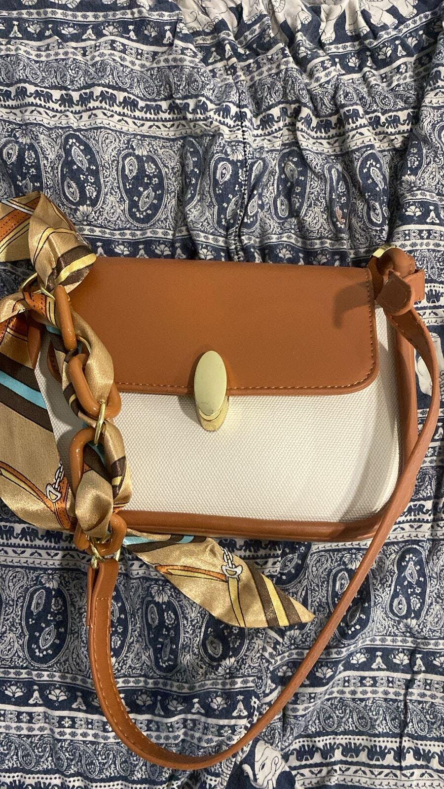 Two-Tone Shoulder Bag with Decorative Scarf – Tan & Cream.A refined fusion of structure and softness, this premium handbag is crafted in a two-tone palette of tan and ivory cream. The smooth, structured body is accentuated with a polished gold-tone clasp, while a hand-twisted silk scarf in ocean-inspired hues graces the shoulder strap—offering a touch of artistry to your everyday elegance. Designed for the modern woman, this bag seamlessly transitions from day to evening, exuding understated luxury with every detail.